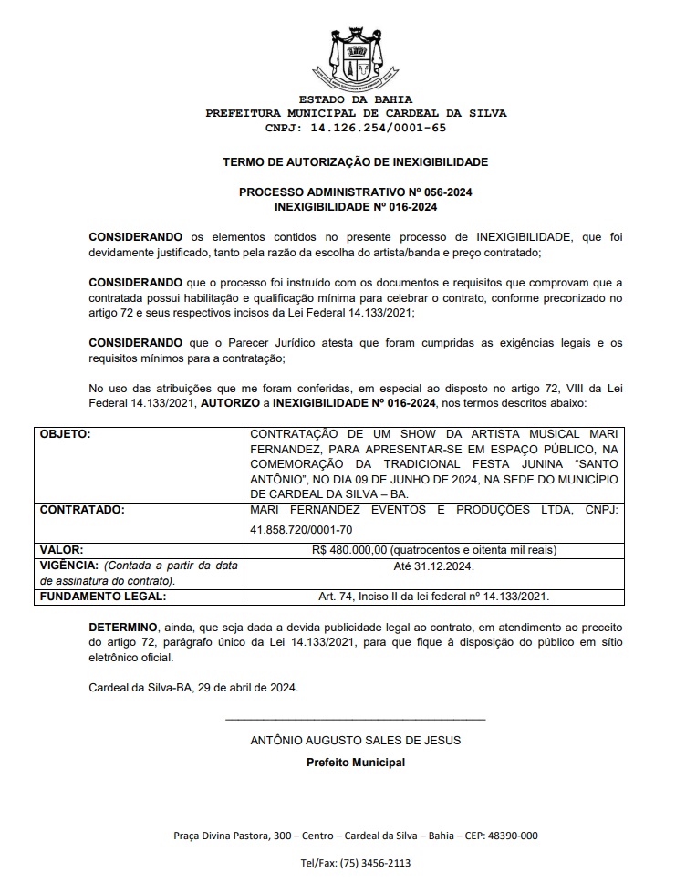 A Prefeitura de Cardeal da Silva, no interior da Bahia, vai gastar um montante milionário no valor de pelo menos R$ 1.160.000 até o momento com festejos juninos. As informações foram confirmadas pelo BNews com base em dados divulgados no Diário Oficial do Município desta quarta-feira (8). Todos os contratos foram celebrados por inexigibilidade de licitação.