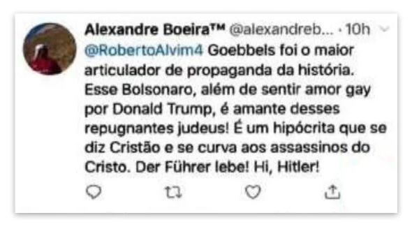"Goebbes foi o maior articulador de propaganda da história. Esse Bolsonaro, além de sentir amor gay por Donald Trump, é amante desses repugnantes judeus! É um hipócrita que se diz Cristão e se curva aos assassinos de Cristo. Der Füher lebe! Hi, Hitler!", escreveu Boeira